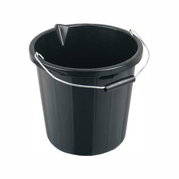 A heavy duty, durable polypropylene bucket with a strong metal handle and integral pouring spout.