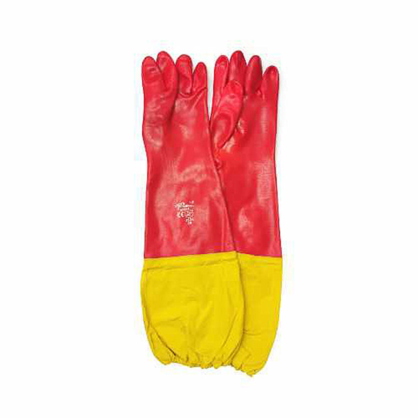 Red lined dip-coated PVC glove, with yellow coated polyester attached to the cuff.